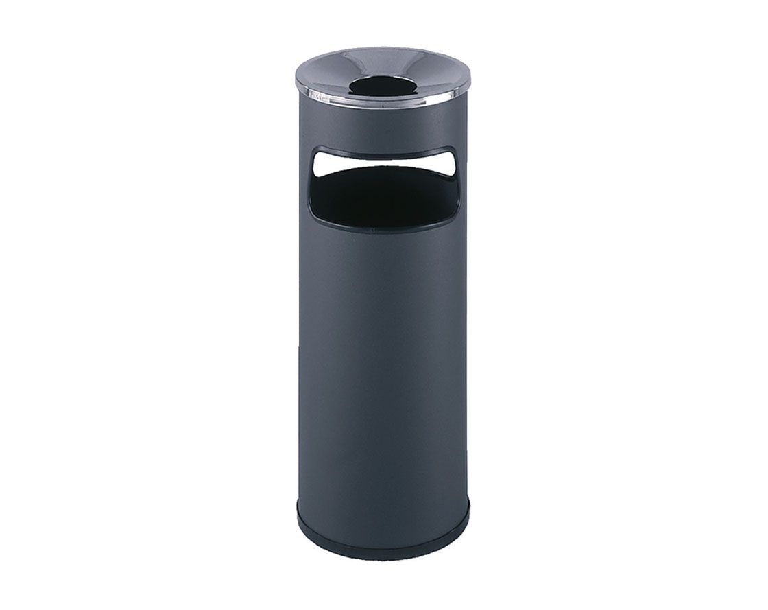 Ein Abfallkorb mit Aschenbecher, der das Löschen der Zigarettenkippen gewährleistet und so die Entstehung von Feuer im Abfallkorb verhindert.