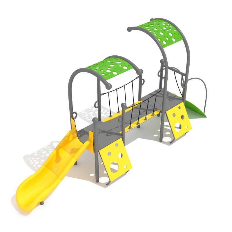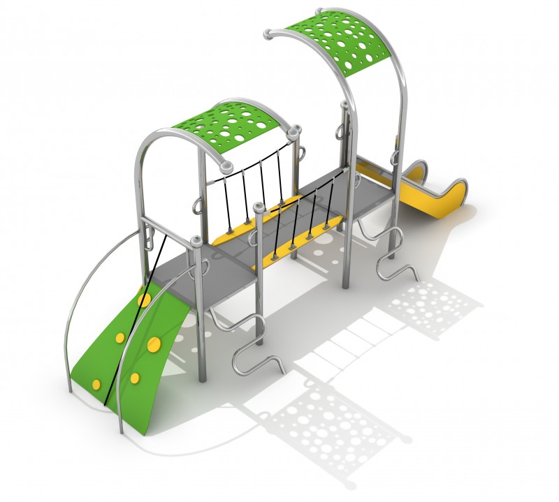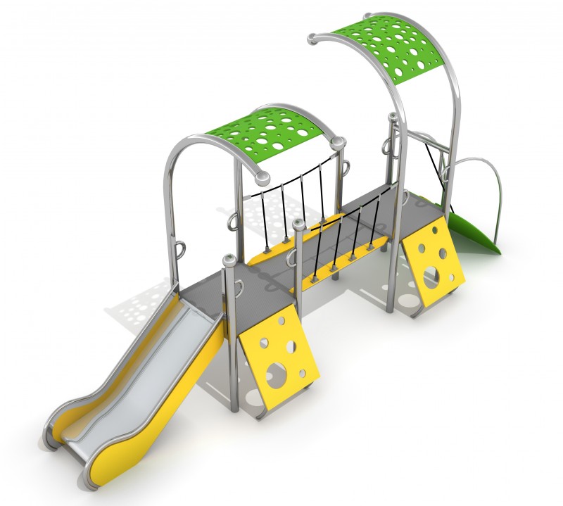 Das Dach, der Niedergang, die seitlichen Teile der Rutsche und die Kletterwand aus dreischichtigem, farbigem HDPE-Kunststoff mit einer Dicke von 15 mm.