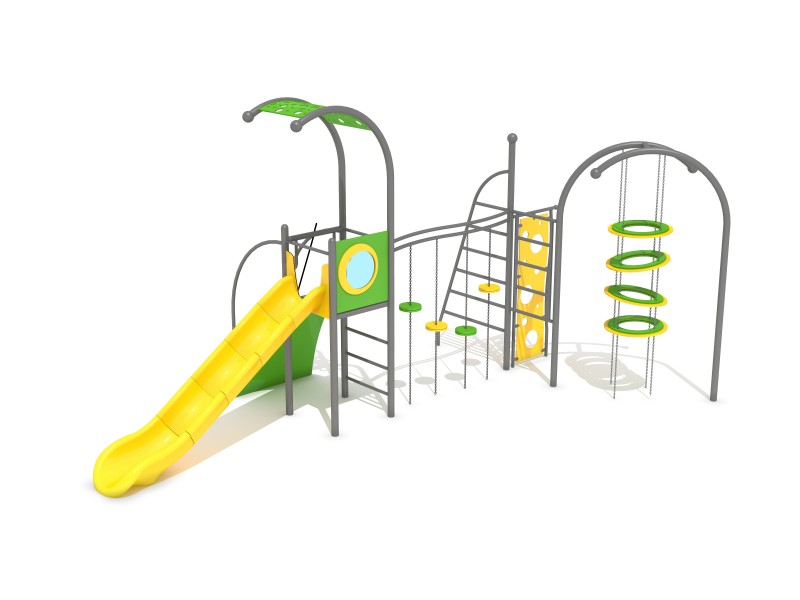 das Dach, der Klettereingang, die seitlichen Teile der Rutsche und die Kletterwand aus dreischichtigem, farbigem 15 mm dicken HDPE-Kunststoff.