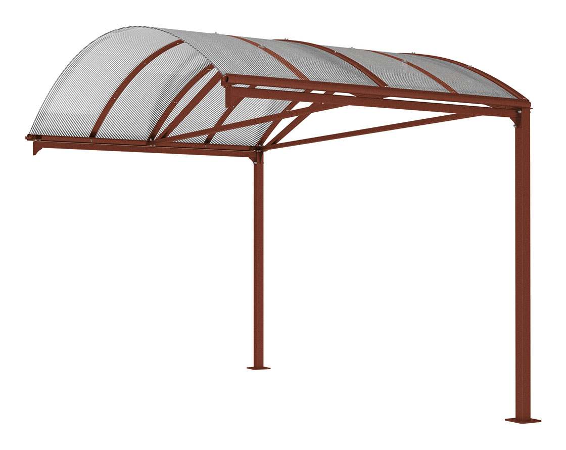 Dach: Querträger aus Stahlrohr 60 x 40 mm, Regenrinnen aus Aluminium 50 x 30 mm. Beschichtet in unseren Standard RAL-Farben. Dach mit UV-beständigen Polycarbonat Stegplatten, 6 mm stark