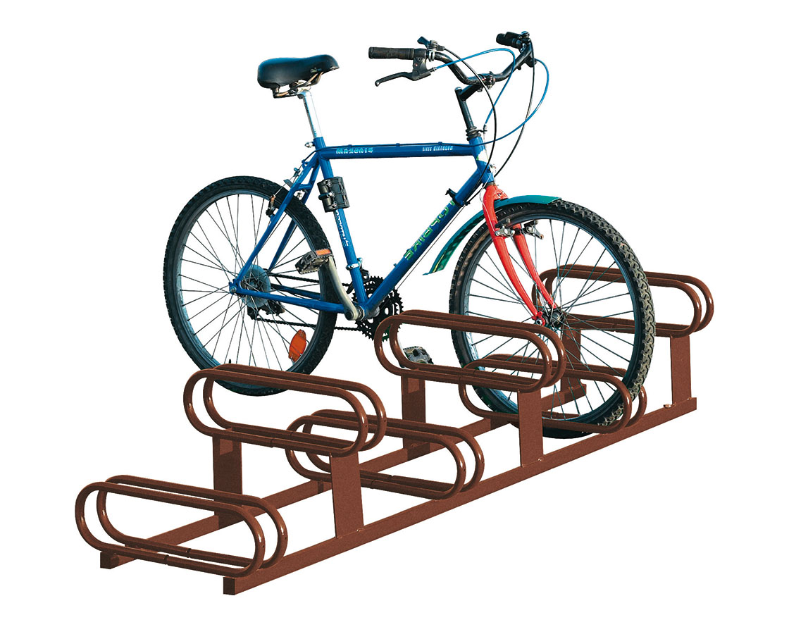Ein effizientes Design mit höhenversetzten Stellplätzen, das verhindert, dass die Lenker aneinander stoßen. Dieser Fahrradständer ist auch doppelseitg benutzbar.