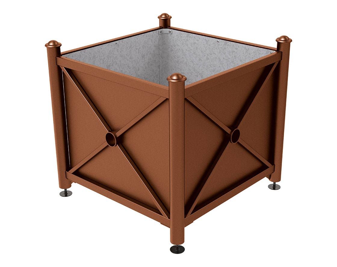 Ein klassisch auftretender Pflanzbehälter, der in zwei Fertigstellungen (100% Stahl oder Stahl & Holz) erhältlich ist und die Möglichkeit bietet, ihn mit einem dekorativen Kopf individuell zu gestalten.