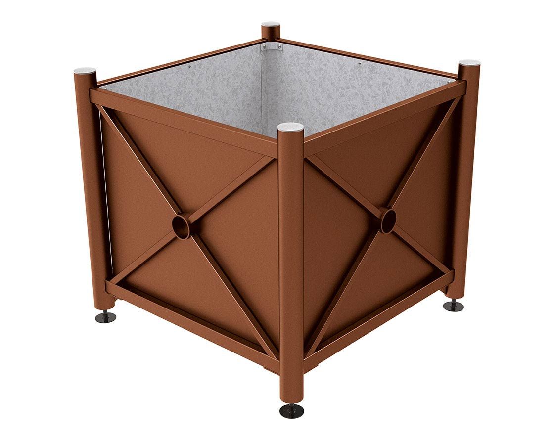 Ein klassisch auftretender Pflanzbehälter, der in zwei Fertigstellungen (100% Stahl oder Stahl & Holz) erhältlich ist und die Möglichkeit bietet, ihn mit einem dekorativen Kopf individuell zu gestalten.