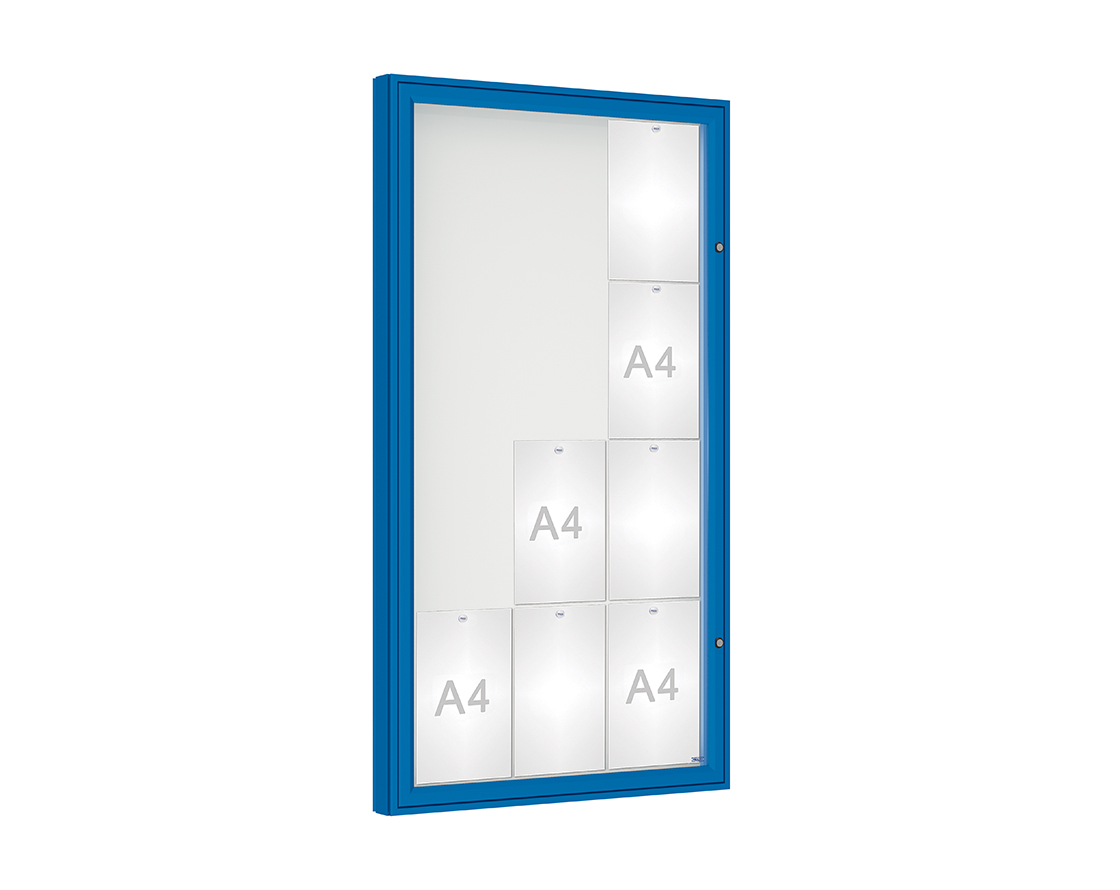 Schaukasten 1000 Farbe:RAL 5010|Verglasung:Plexichocs|Abmessungen:12 A4 – B 750 x H 1350 mm
