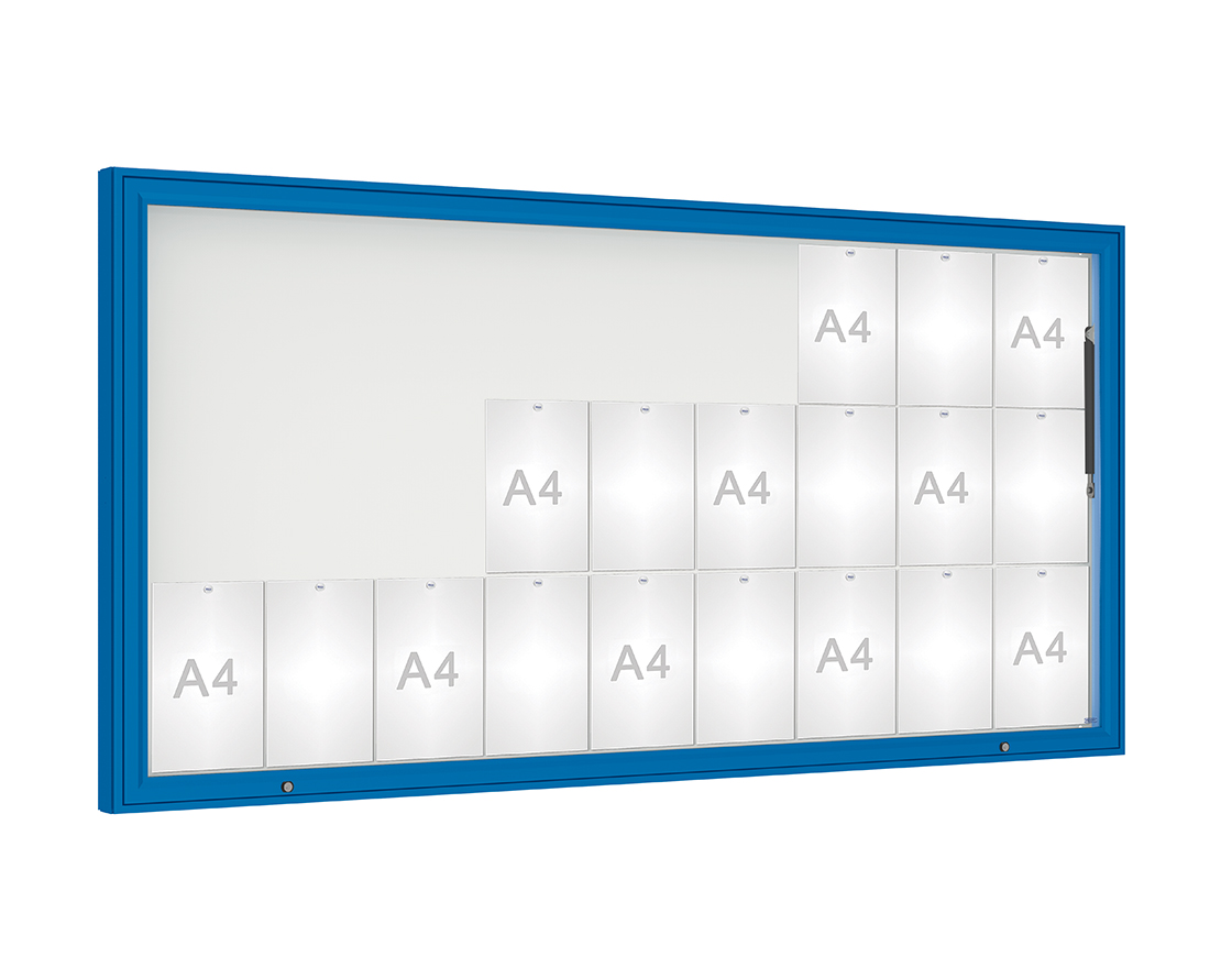 Schaukasten 1000 Farbe:RAL 5010|Verglasung:Plexichocs|Abmessungen:27 A4 - B 2010 x H 1000 mm