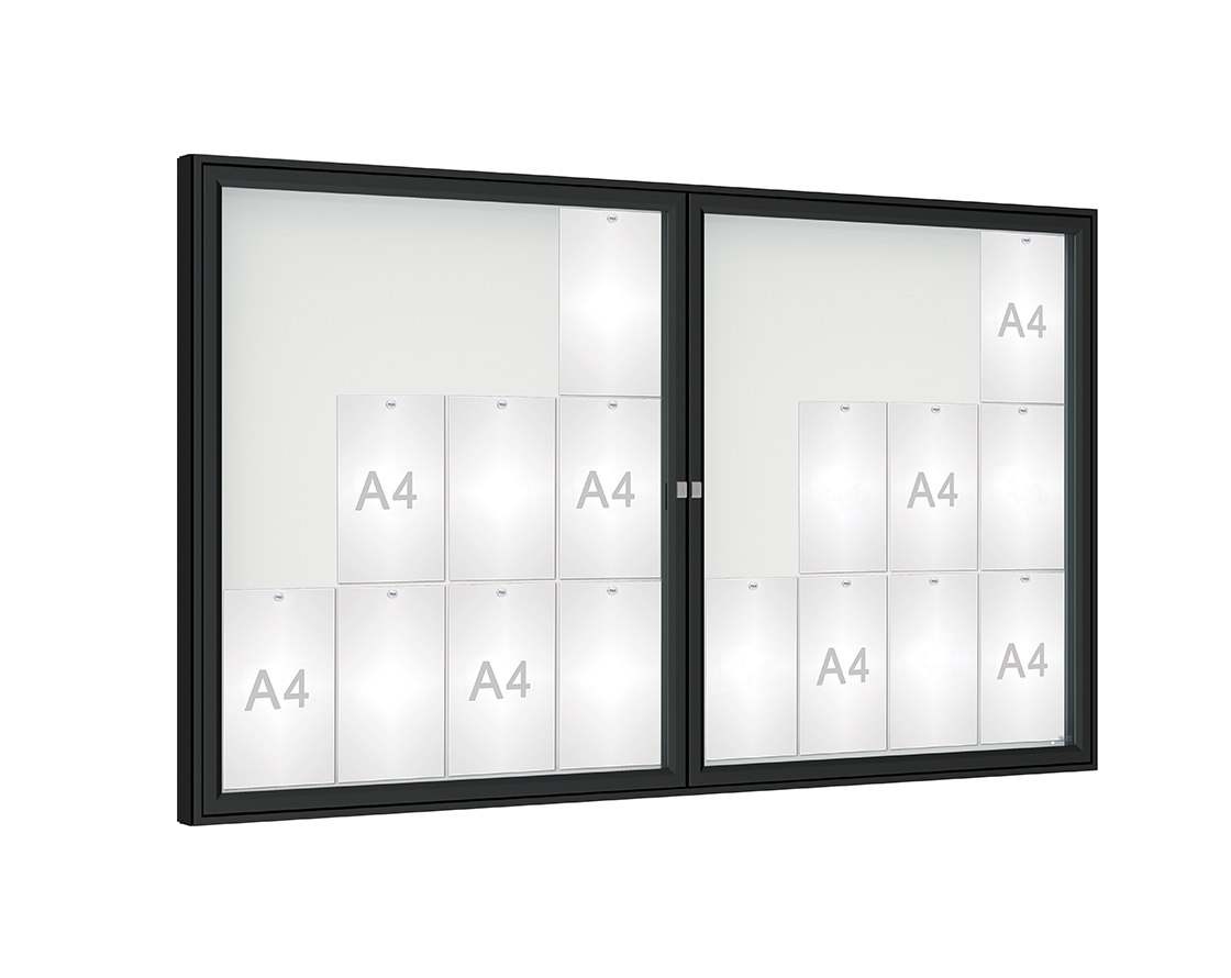 Schaukasten 1000 Farbe:RAL 9005|Verglasung:Plexichocs|Abmessungen:24 A4 – B 1800 x H 1050 mm