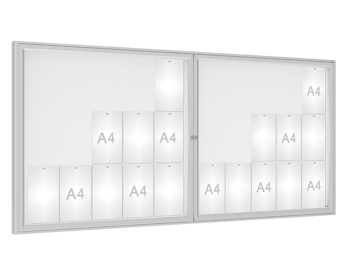 Schaukasten 1000 Farbe:Silber eloxiert|Verglasung:Plexichocs|Abmessungen:30 A4 - B 2250 x H 1050 mm