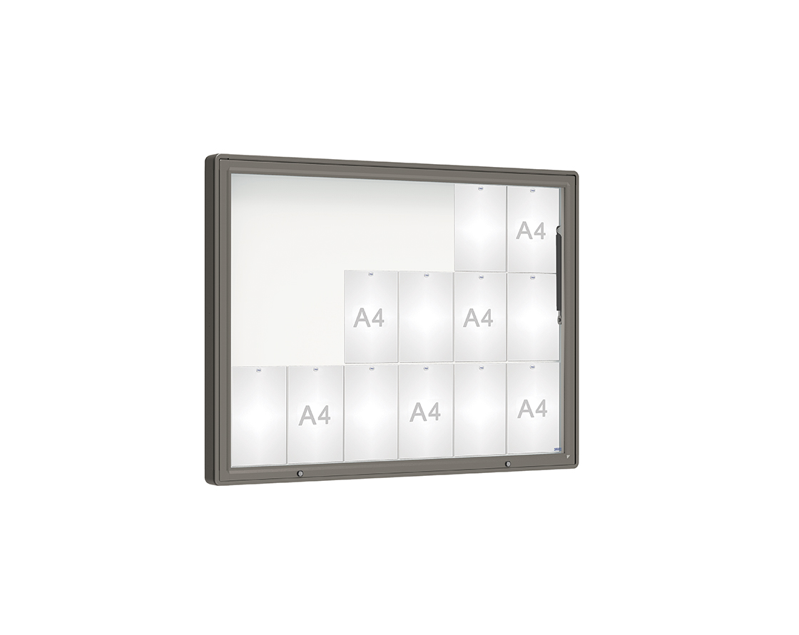 Schaukasten 2000 Farbe:Procity grau|Verglasung:Plexichocs|Abmessungen:18 A4 - B 1350 x H 1000 mm
