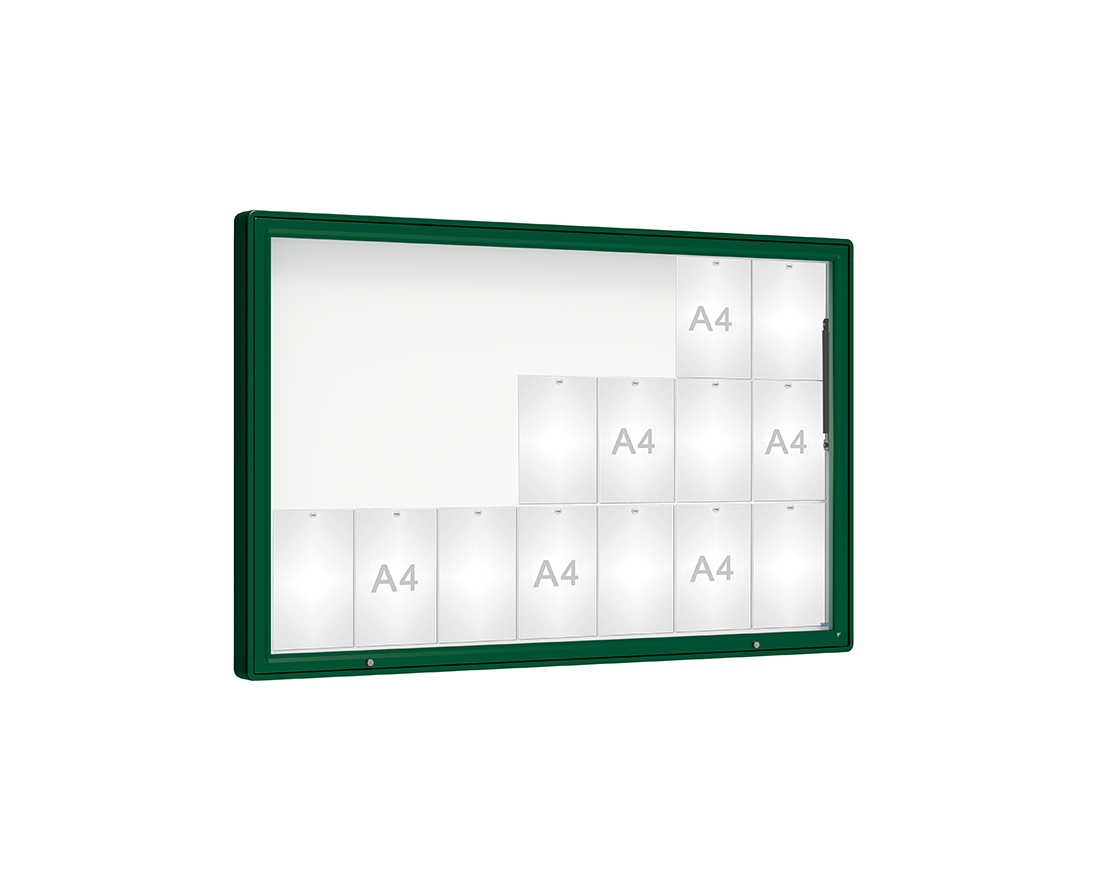 Schaukasten 2000 Farbe:RAL 6005|Verglasung:Plexichocs|Abmessungen:21 A4 - B 1600 x H 1000 mm