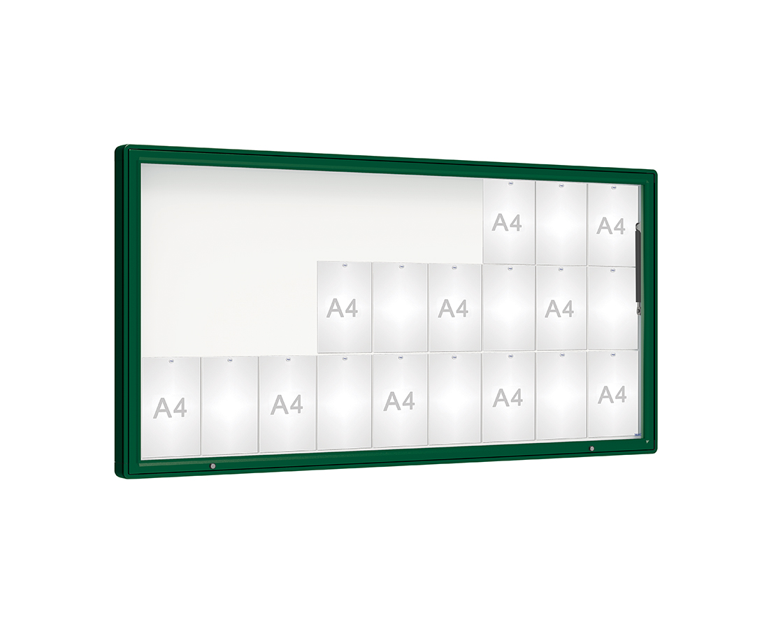 Schaukasten 2000 Farbe:RAL 6005|Verglasung:Plexichocs|Abmessungen:27 A4 - B 2010 x H 1000 mm