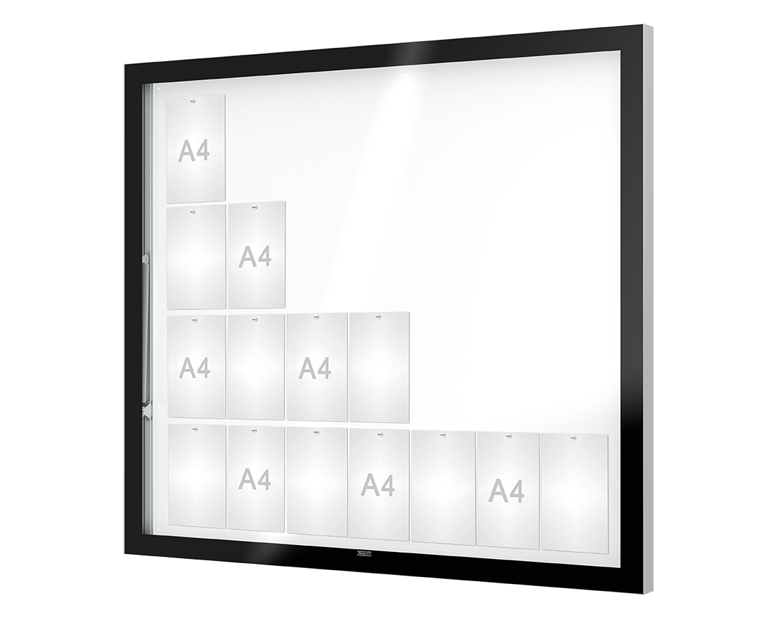 Dieser moderne Premium-Schaukasten bietet dank seiner Ganzglas-Front, dem schwarzen Siebdruckrahmen und dem extra-flachen Aluminiumprofil, eine optimale Sichtfläche.