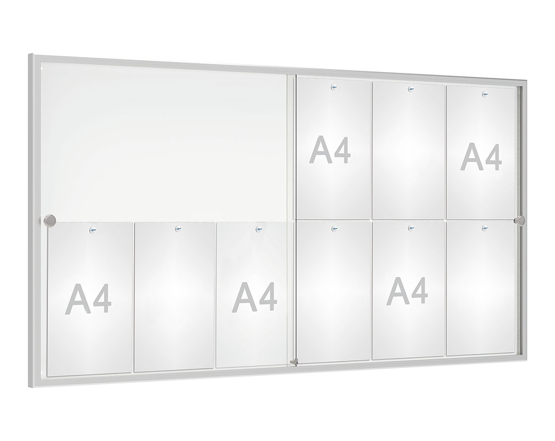 Der ideale Schaukasten für Eingangshallen und Flure: Die Schiebetüren stören den Personenverkehr nicht.