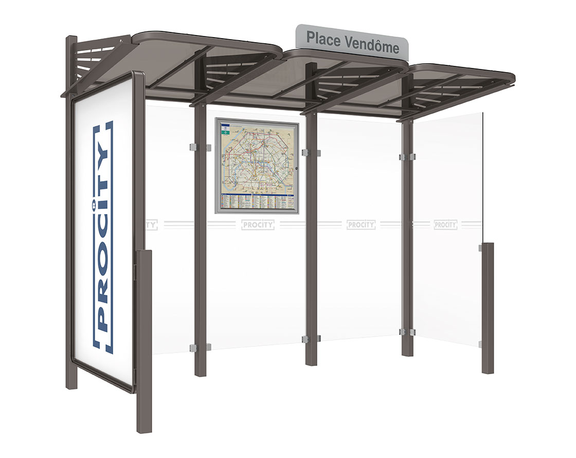 Wartehalle Convi Farbe:Procity grau|Struktur:Schaukasten 2000 links und Seitenverkleidung rechts