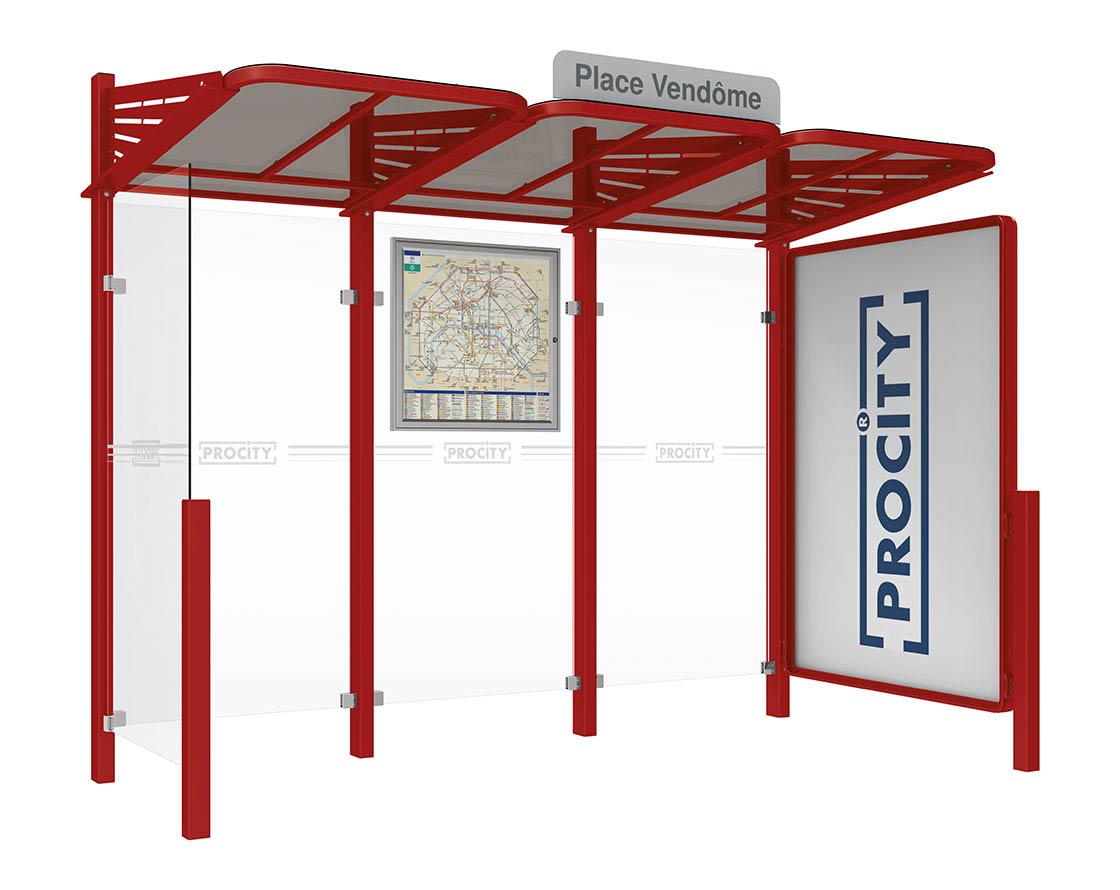 Wartehalle Convi Farbe:RAL 3004|Struktur:Schaukasten 2000 rechts und Seiterverkleidung links