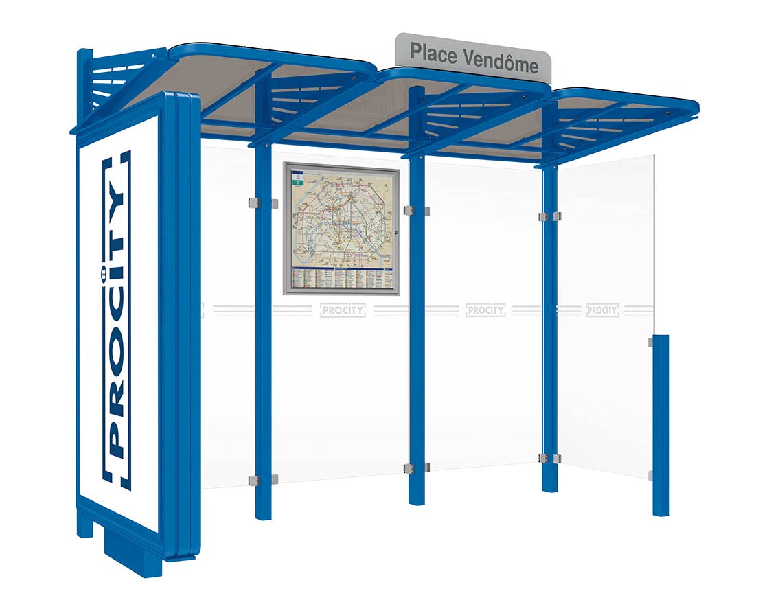 Wartehalle Convi Farbe:RAL 5010|Struktur:Beleuchteter VIP-Caisson links und Seitenverkleidung rechts