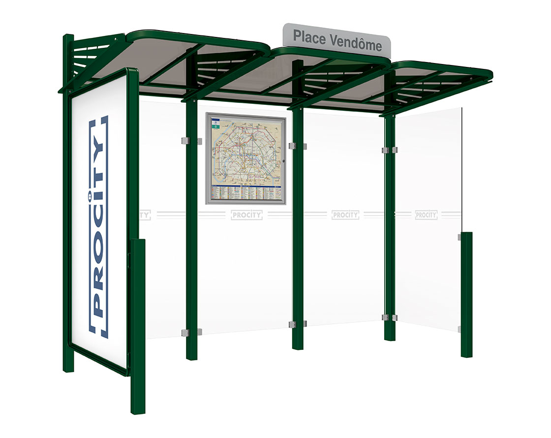 Wartehalle Convi Farbe:RAL 6005|Struktur:Schaukasten 2000 links und Seitenverkleidung rechts