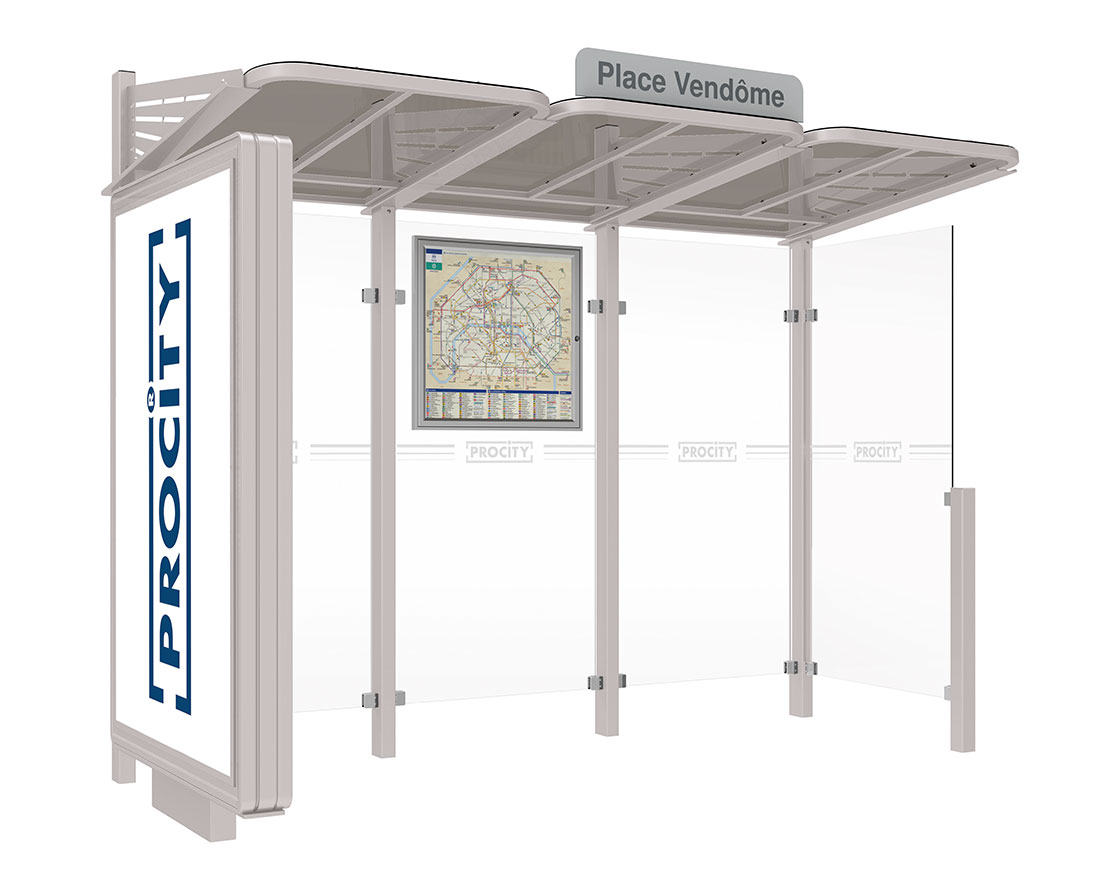 Wartehalle Convi Farbe:RAL 7044|Struktur:Beleuchteter VIP-Caisson links und Seitenverkleidung rechts
