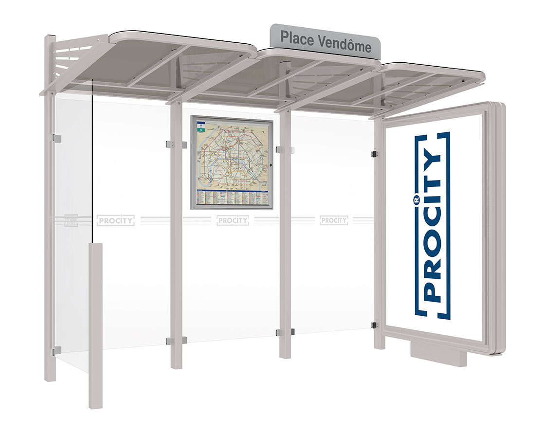 Wartehalle Convi Farbe:RAL 7044|Struktur:Beleuchteter VIP-Caisson rechts und Seitenverkleidung links