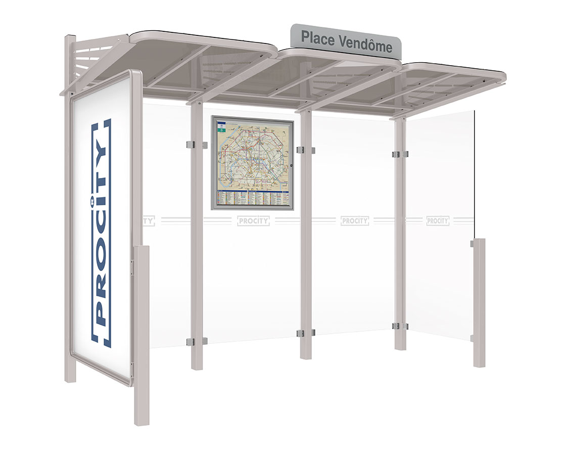 Wartehalle Convi Farbe:RAL 7044|Struktur:Schaukasten 2000 links und Seitenverkleidung rechts
