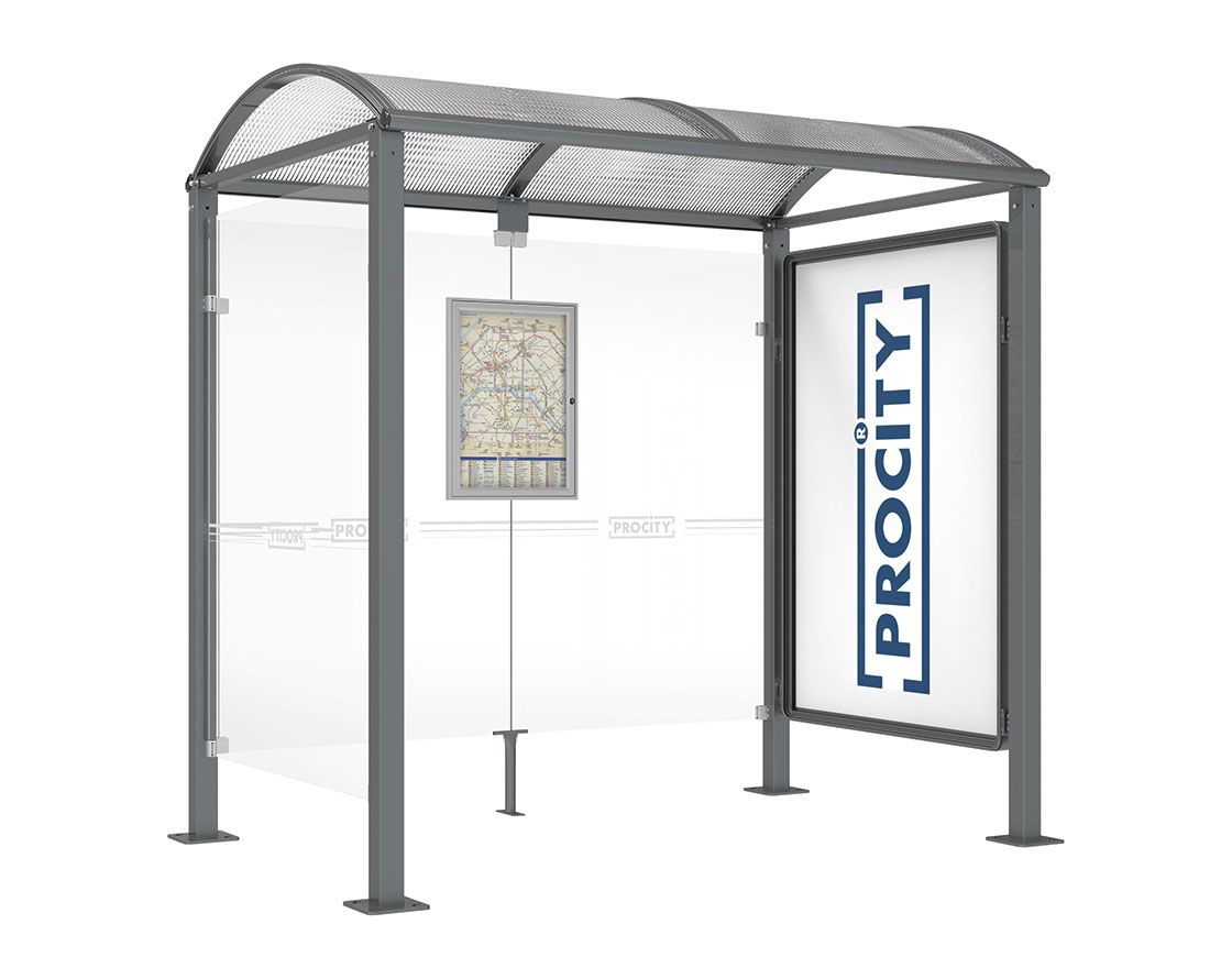 Wartehalle Malta Farbe:Procity grau|Länge:2 500 mm|Struktur:Schaukasten 2000 rechts und Seiterverkleidung links