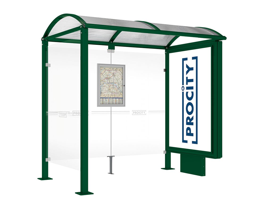 Wartehalle Malta Farbe:RAL 6005|Länge:2 500 mm|Struktur:Beleuchteter VIP-Caisson rechts und Seitenverkleidung links