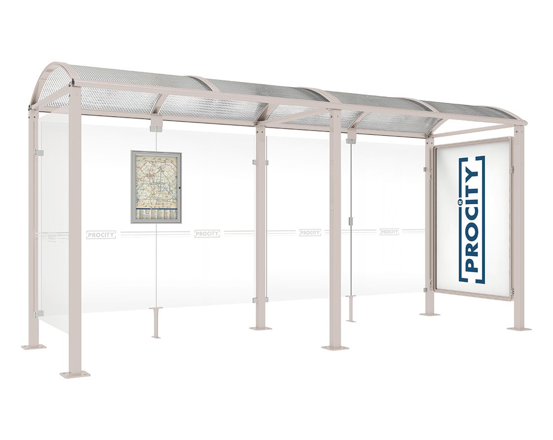 Wartehalle Malta Farbe:RAL 7044|Länge:5 000 mm|Struktur:Schaukasten 2000 rechts und Seiterverkleidung links