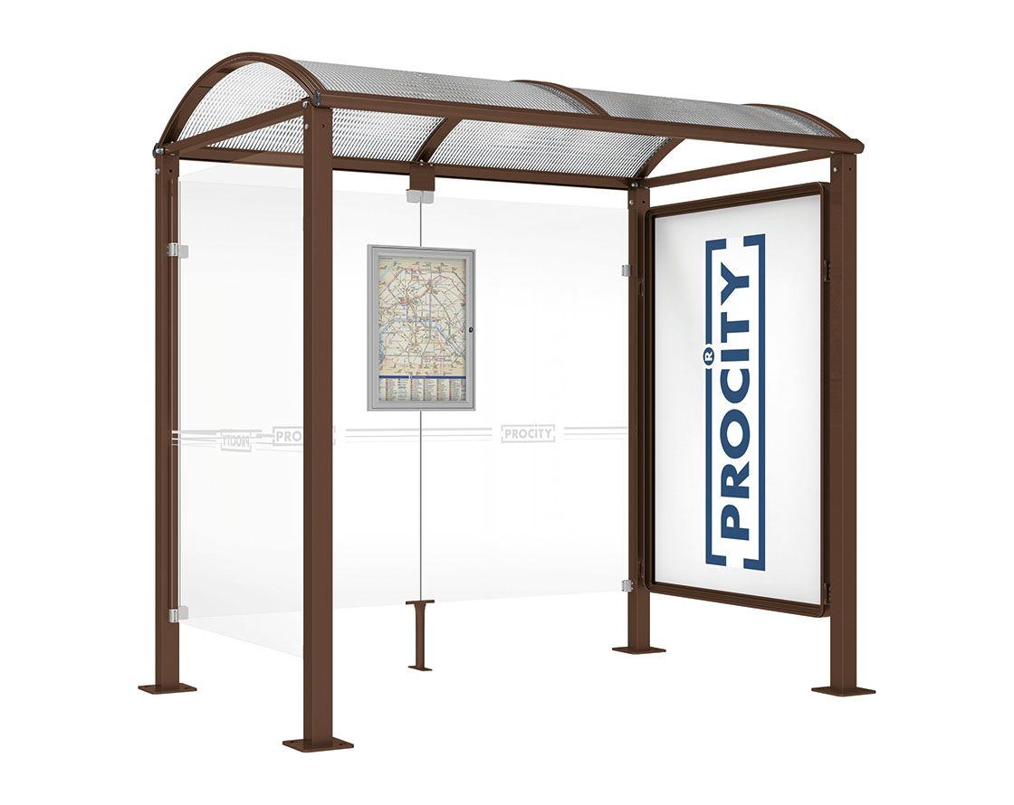 Wartehalle Malta Farbe:RAL 8017|Länge:2 500 mm|Struktur:Schaukasten 2000 rechts und Seiterverkleidung links