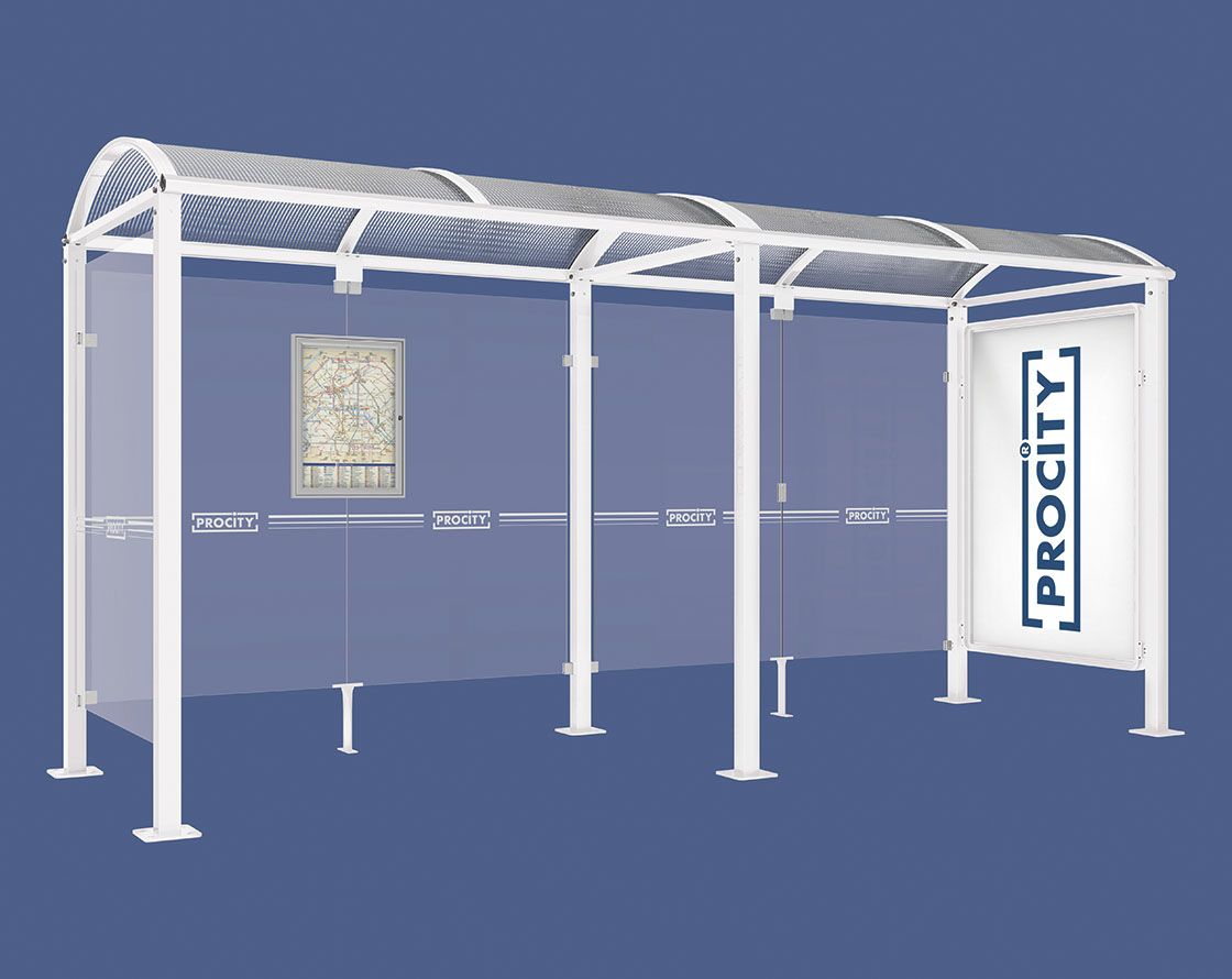 Wartehalle Malta Farbe:RAL 9010|Länge:5 000 mm|Struktur:Schaukasten 2000 rechts und Seiterverkleidung links