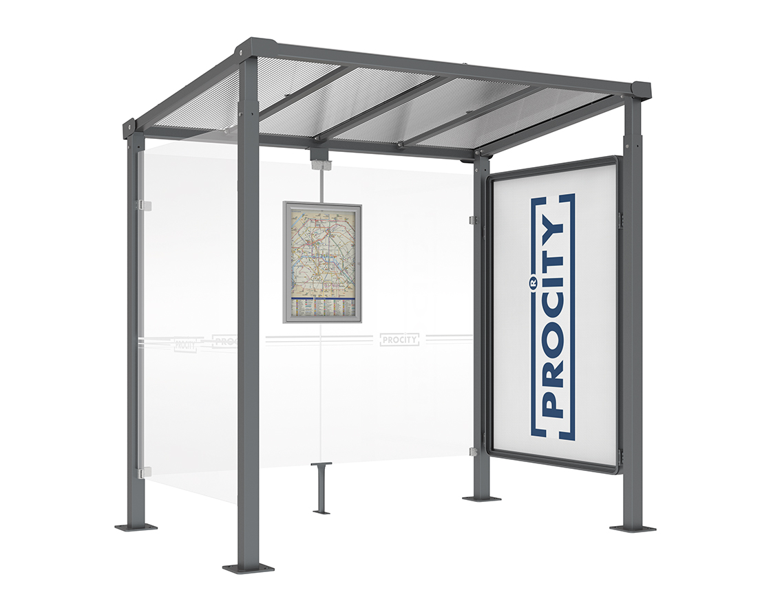 Wartehalle Milano Farbe:Procity grau|Länge:Länge 2500 mm|Struktur:Schaukasten 2000 und 1 Seitenverkleidung