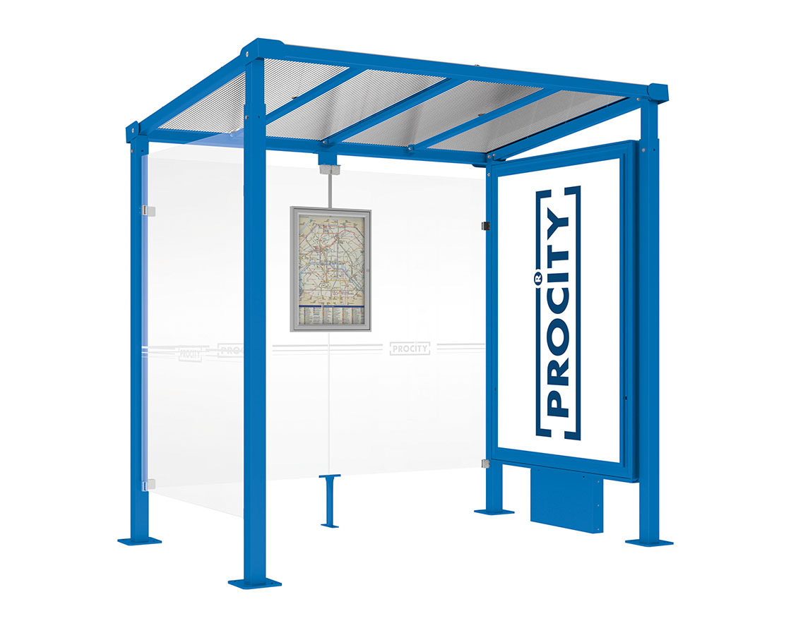 Wartehalle Milano Farbe:RAL 5010|Länge:Länge 2500 mm|Struktur:Leuchtcaisson VIP auf Mittelfuß und 1 Seitenverkleidung