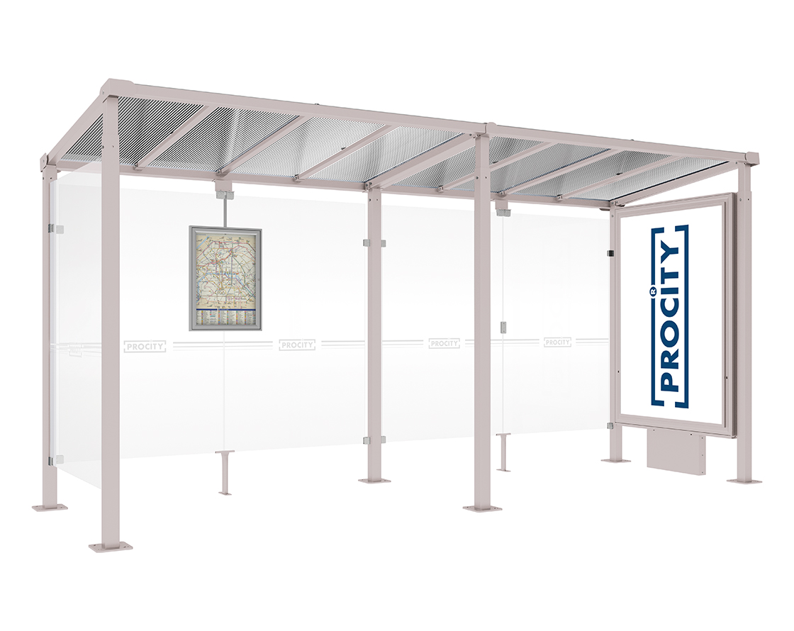 Wartehalle Milano Farbe:RAL 7044|Länge:Länge 5000 mm|Struktur:Leuchtcaisson VIP auf Mittelfuß und 1 Seitenverkleidung