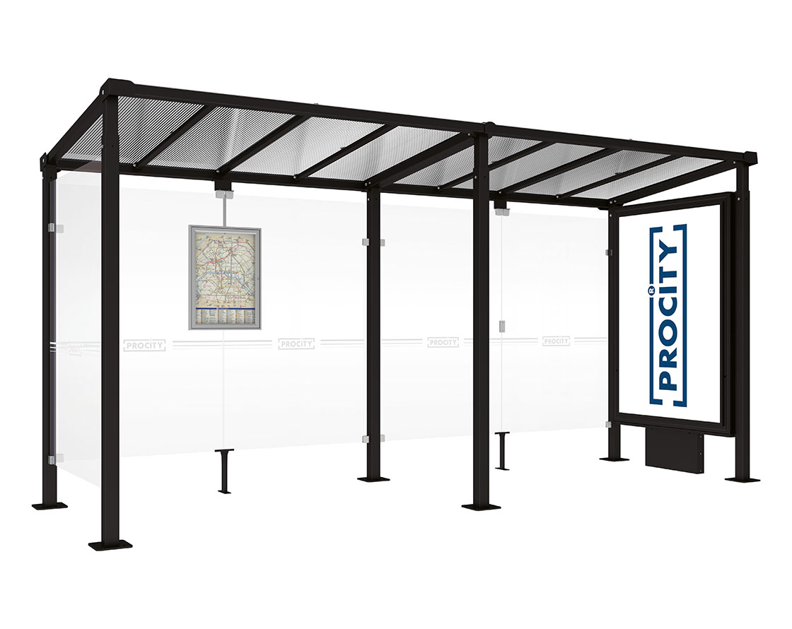 Wartehalle Milano Farbe:RAL 9005|Länge:Länge 5000 mm|Struktur:Leuchtcaisson VIP auf Mittelfuß und 1 Seitenverkleidung