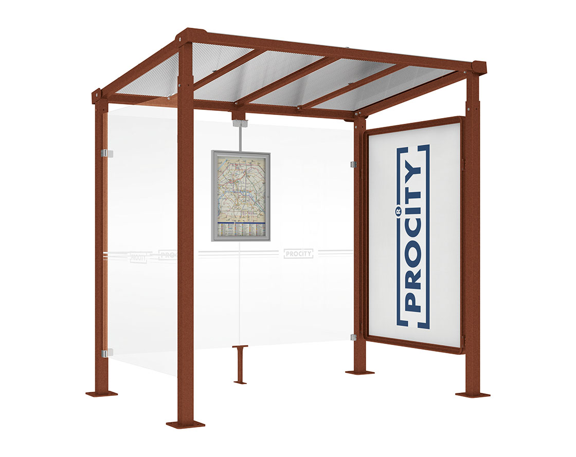 Wartehalle Milano Farbe:Rost Korten Effekt|Länge:Länge 2500 mm|Struktur:Schaukasten 2000 und 1 Seitenverkleidung