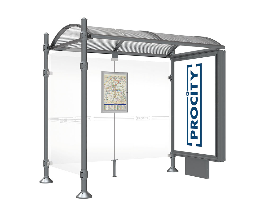 Wartehalle Province Agora Farbe:Procity grau|Länge:2500 mm|Struktur:Mit Leuchtcaisson und einer Seitenverkleidung