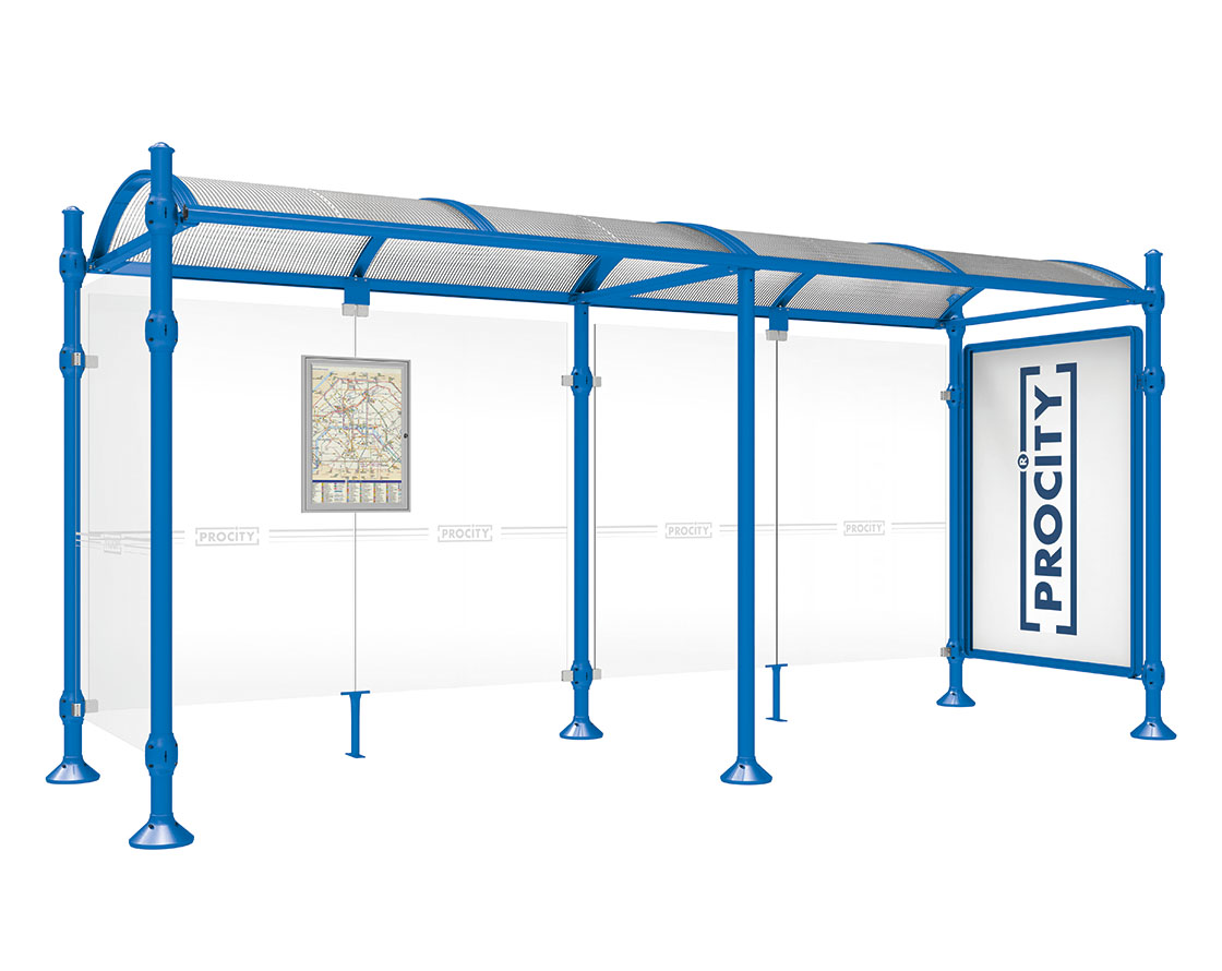 Wartehalle Province Agora Farbe:RAL 5010|Länge:5000 mm|Struktur:Mit Schaukasten 2000 und eienr Seitenverkleidung