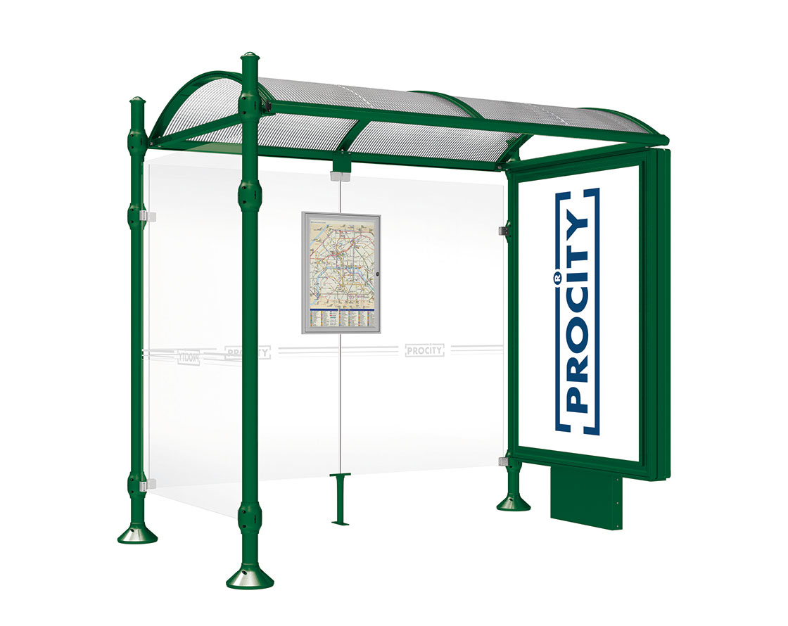 Wartehalle Province Agora Farbe:RAL 6005|Länge:2500 mm|Struktur:Mit Leuchtcaisson und einer Seitenverkleidung