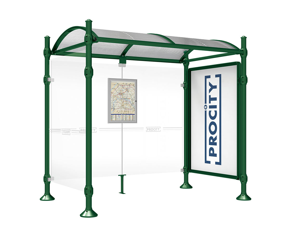 Wartehalle Province Agora Farbe:RAL 6005|Länge:2500 mm|Struktur:Mit Schaukasten 2000 und eienr Seitenverkleidung