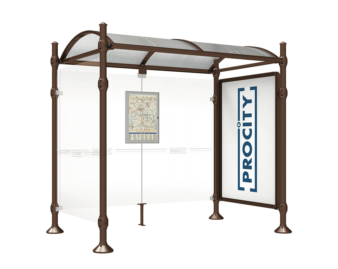 Wartehalle Province Agora Farbe:RAL 8017|Länge:2500 mm|Struktur:Mit Schaukasten 2000 und eienr Seitenverkleidung