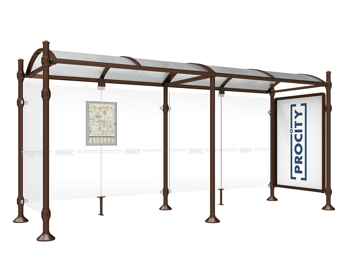 Wartehalle Province Agora Farbe:RAL 8017|Länge:5000 mm|Struktur:Mit Schaukasten 2000 und eienr Seitenverkleidung