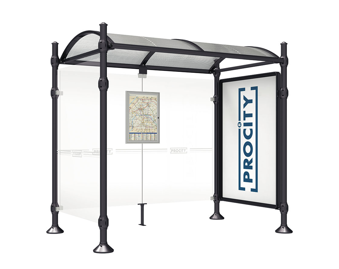 Wartehalle Province Agora Farbe:RAL 9005|Länge:2500 mm|Struktur:Mit Schaukasten 2000 und eienr Seitenverkleidung