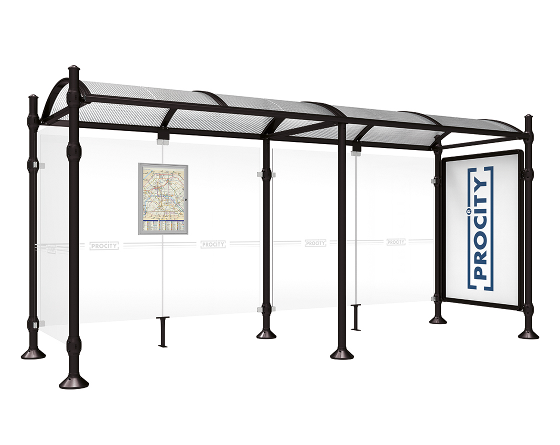 Wartehalle Province Agora Farbe:RAL 9005|Länge:5000 mm|Struktur:Mit Schaukasten 2000 und eienr Seitenverkleidung