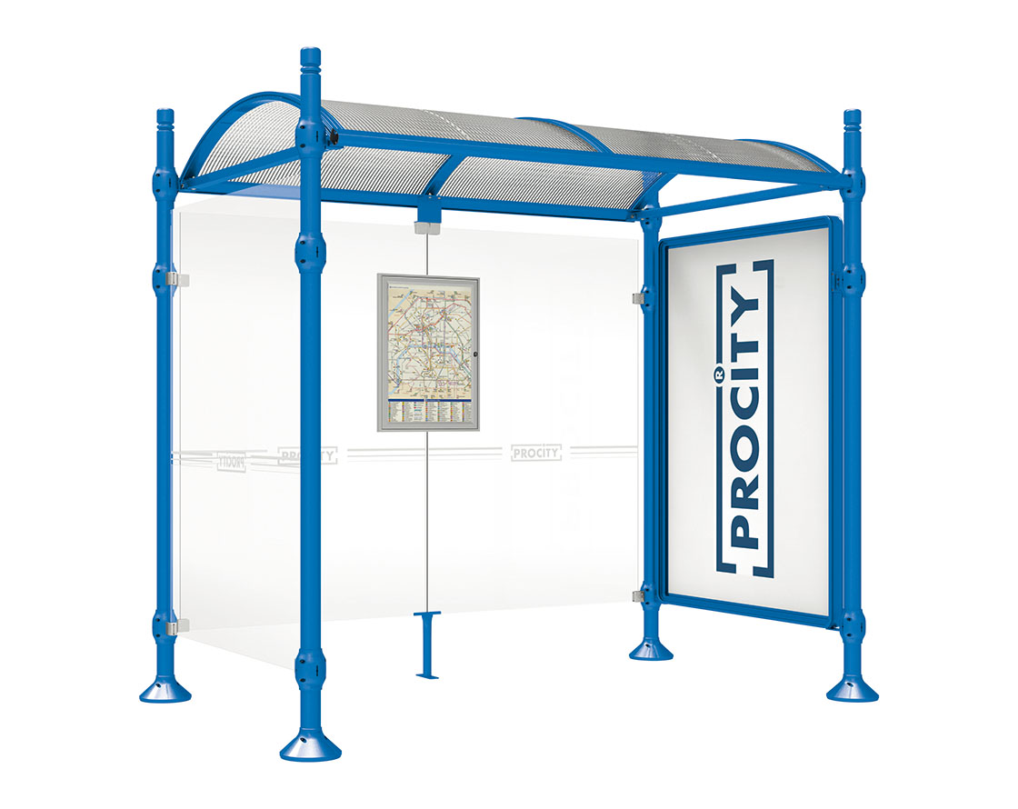 Wartehalle Province City Farbe:RAL 5010|Länge:2500 mm|Struktur:Mit Schaukasten 2000 und eienr Seitenverkleidung
