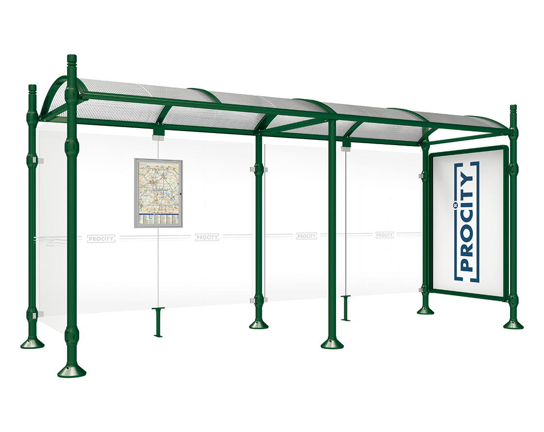 Wartehalle Province City Farbe:RAL 6005|Länge:5000 mm|Struktur:Mit Schaukasten 2000 und eienr Seitenverkleidung