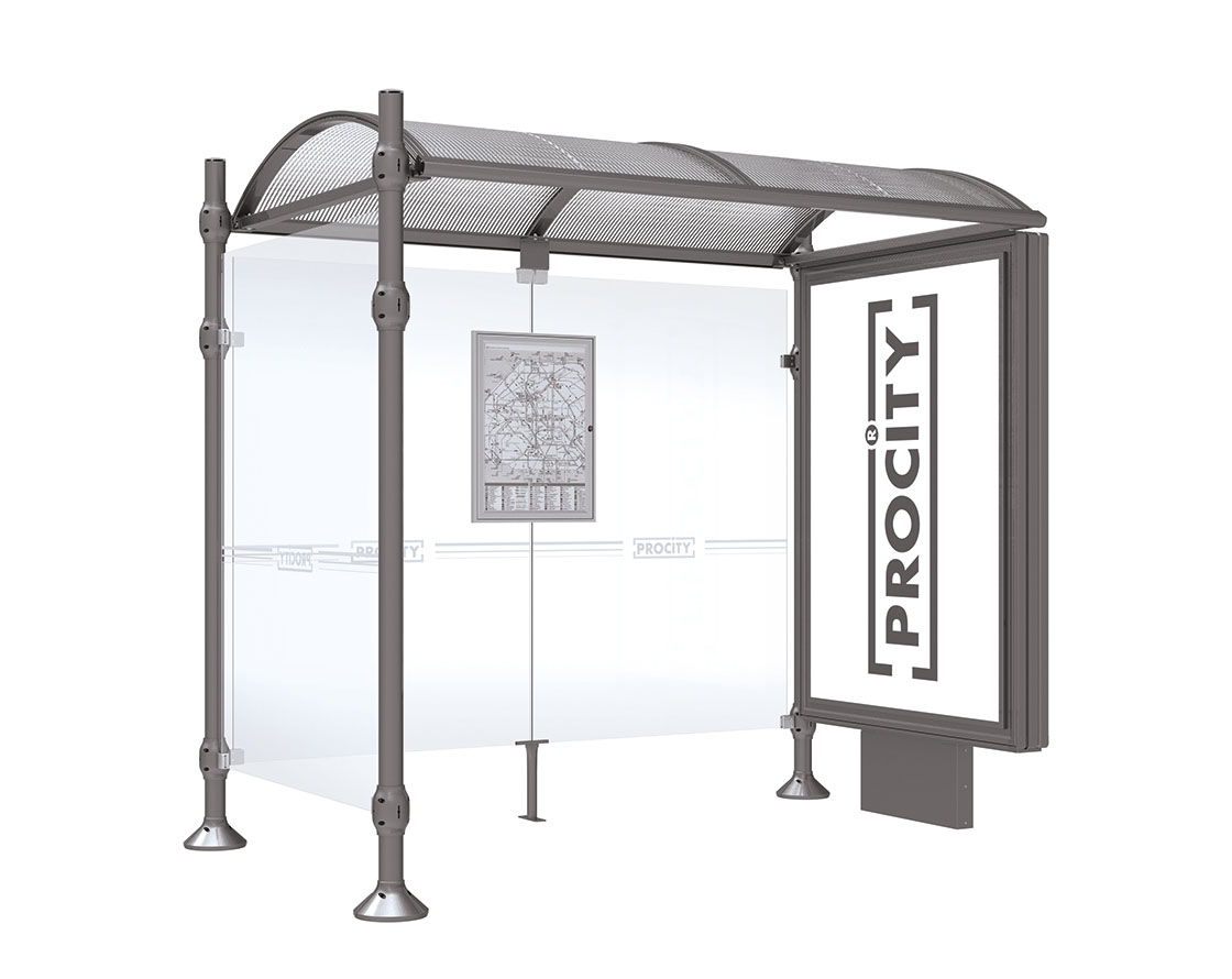 Wartehalle Province Gebürsteter Edelstahl Farbe:Procity grau|Länge:2500 mm|Struktur:Mit Leuchtcaisson und einer Seitenverkleidung