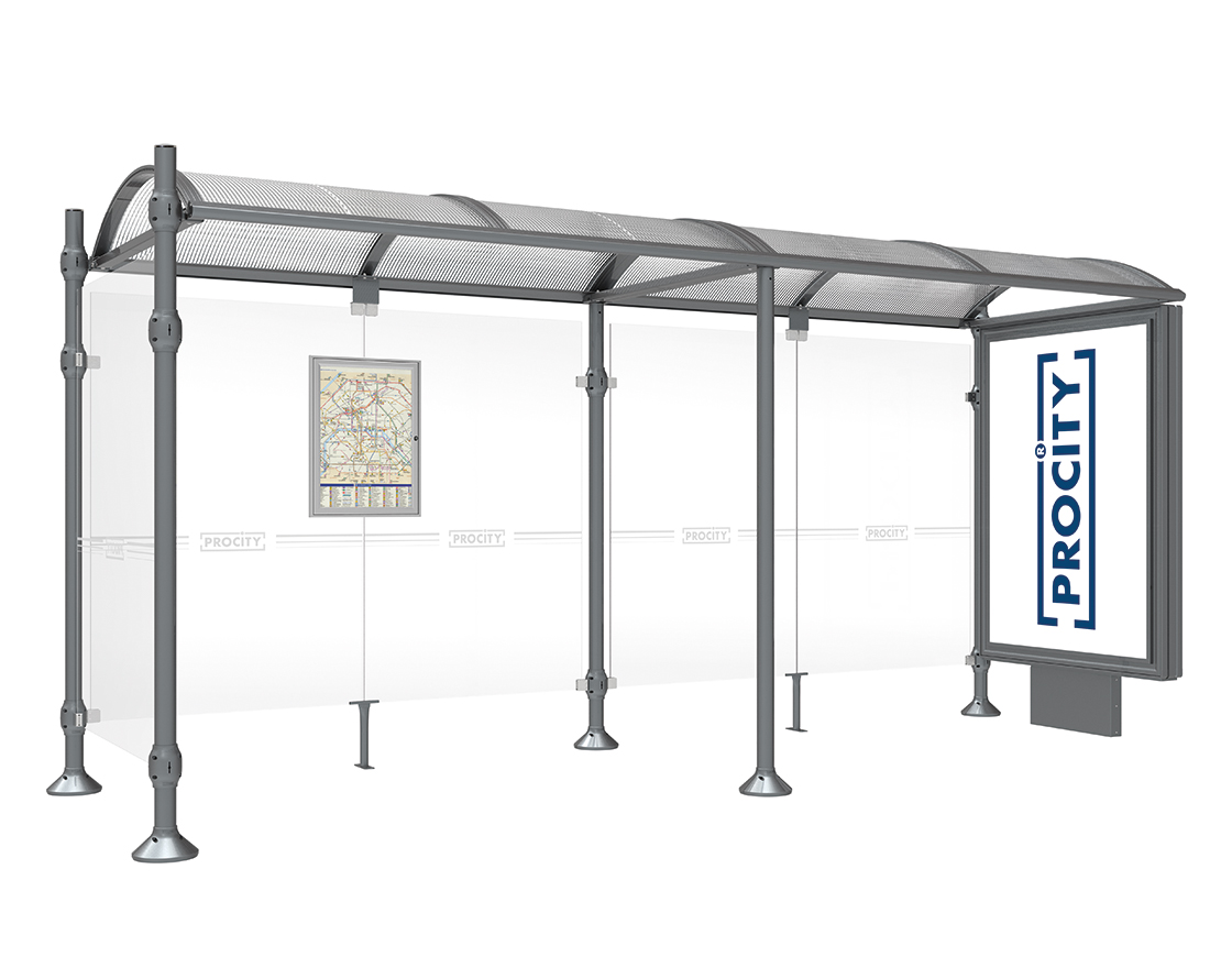 Wartehalle Province Gebürsteter Edelstahl Farbe:Procity grau|Länge:5000 mm|Struktur:Mit Leuchtcaisson und einer Seitenverkleidung