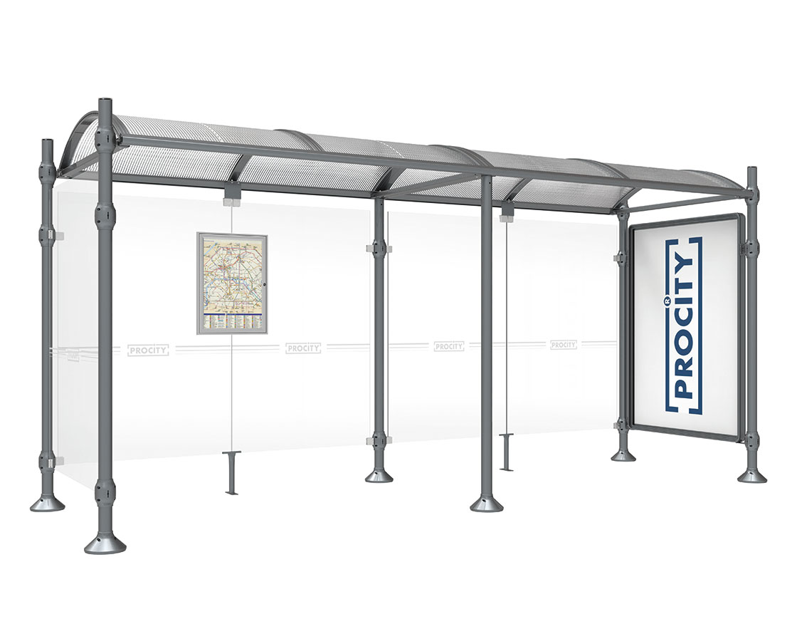 Wartehalle Province Gebürsteter Edelstahl Farbe:Procity grau|Länge:5000 mm|Struktur:Mit Schaukasten 2000 und eienr Seitenverkleidung