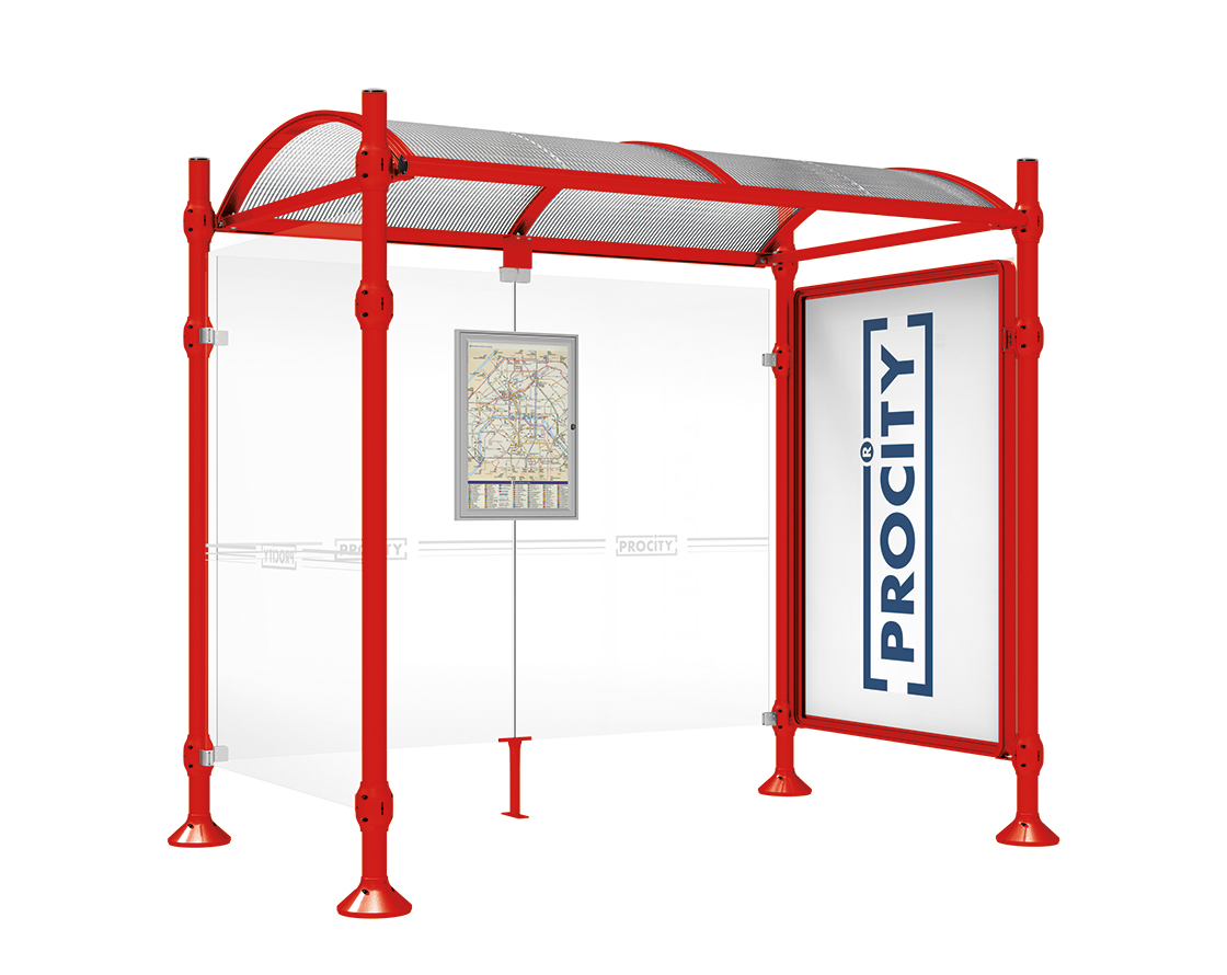 Wartehalle Province Gebürsteter Edelstahl Farbe:RAL 3020|Länge:2500 mm|Struktur:Mit Schaukasten 2000 und eienr Seitenverkleidung