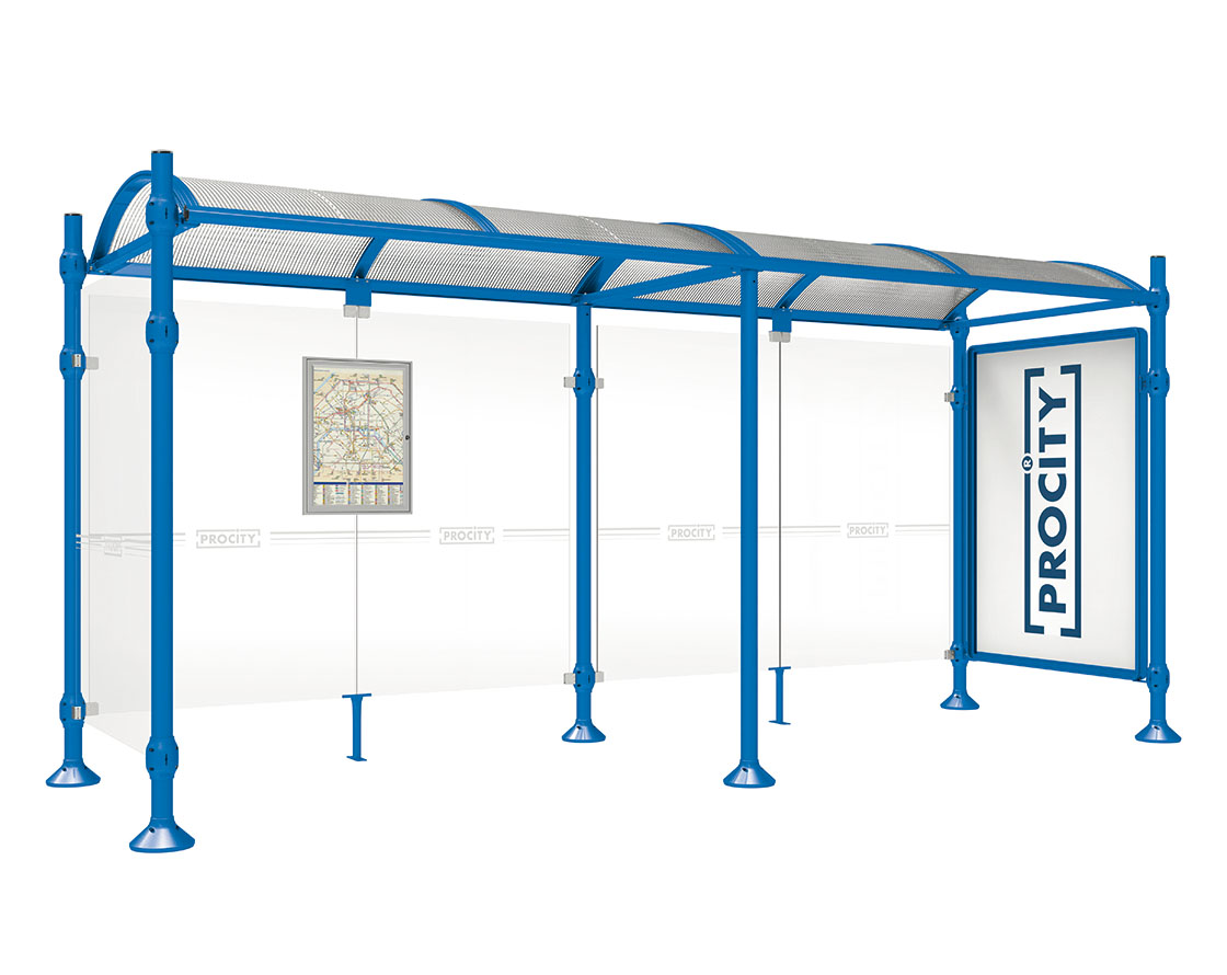 Wartehalle Province Gebürsteter Edelstahl Farbe:RAL 5010|Länge:5000 mm|Struktur:Mit Schaukasten 2000 und eienr Seitenverkleidung