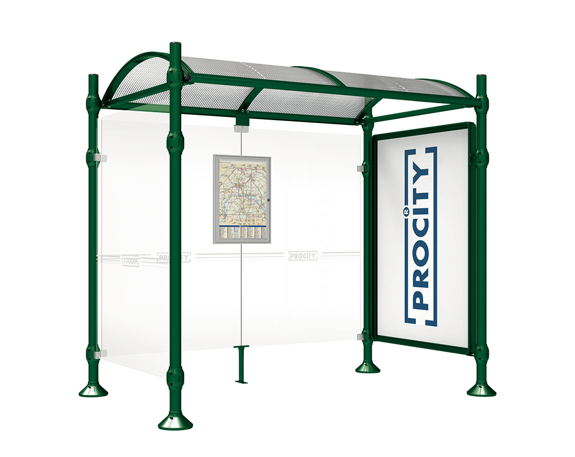 Wartehalle Province Gebürsteter Edelstahl Farbe:RAL 6005|Länge:2500 mm|Struktur:Mit Schaukasten 2000 und eienr Seitenverkleidung