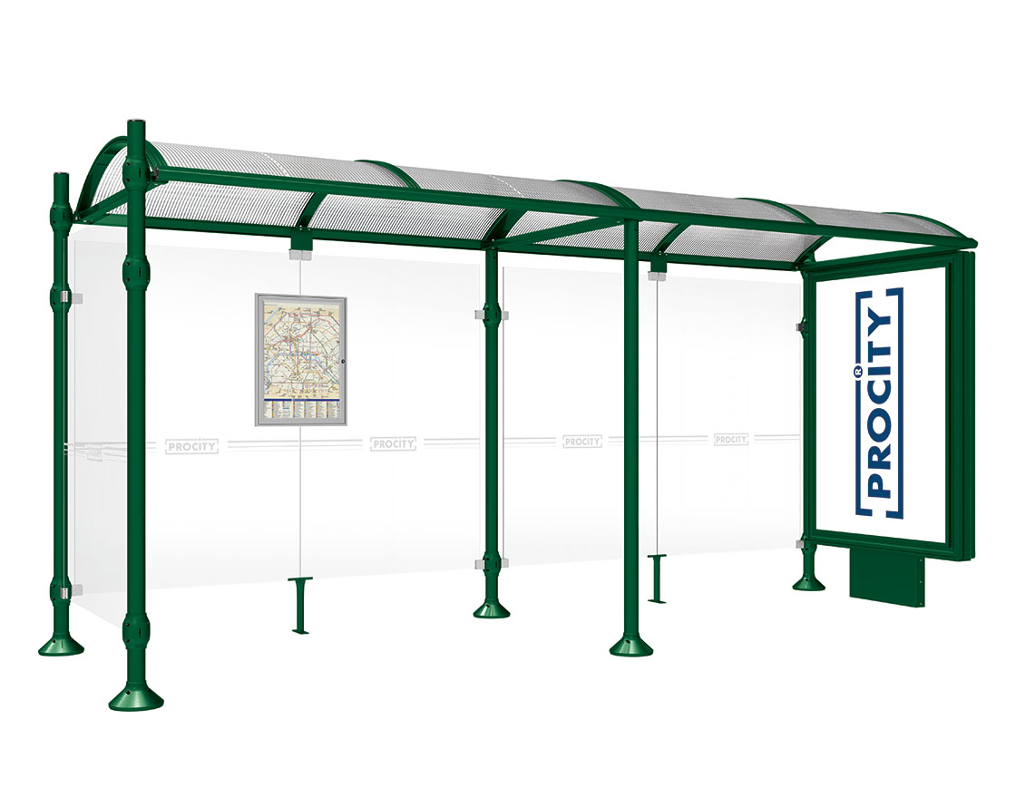 Wartehalle Province Gebürsteter Edelstahl Farbe:RAL 6005|Länge:5000 mm|Struktur:Mit Leuchtcaisson und einer Seitenverkleidung